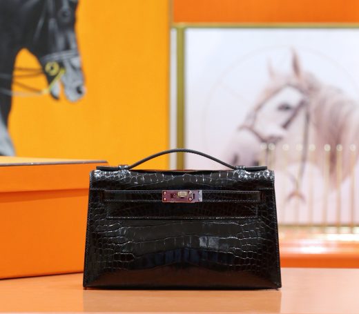 MrBirkin Mini Kelly Pochette Shiny Alligator Crocodile Black Silver Hardware 22cm Full Handmade