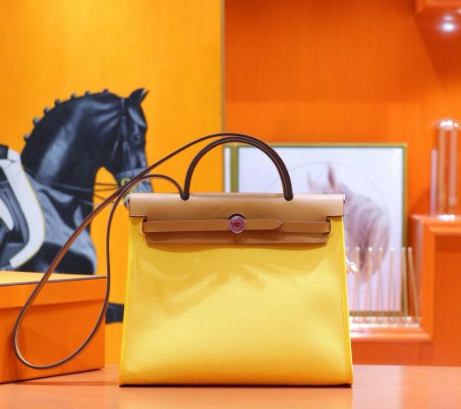 MrBirkin Herbag Canvas & Leather Amber Yellow Silver Hardware 31cm Full Handmade