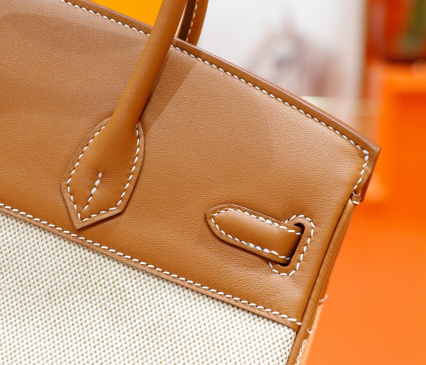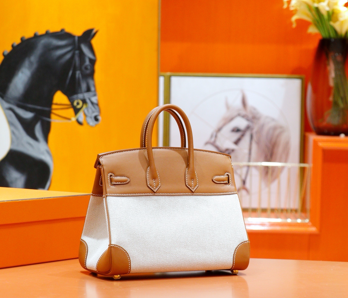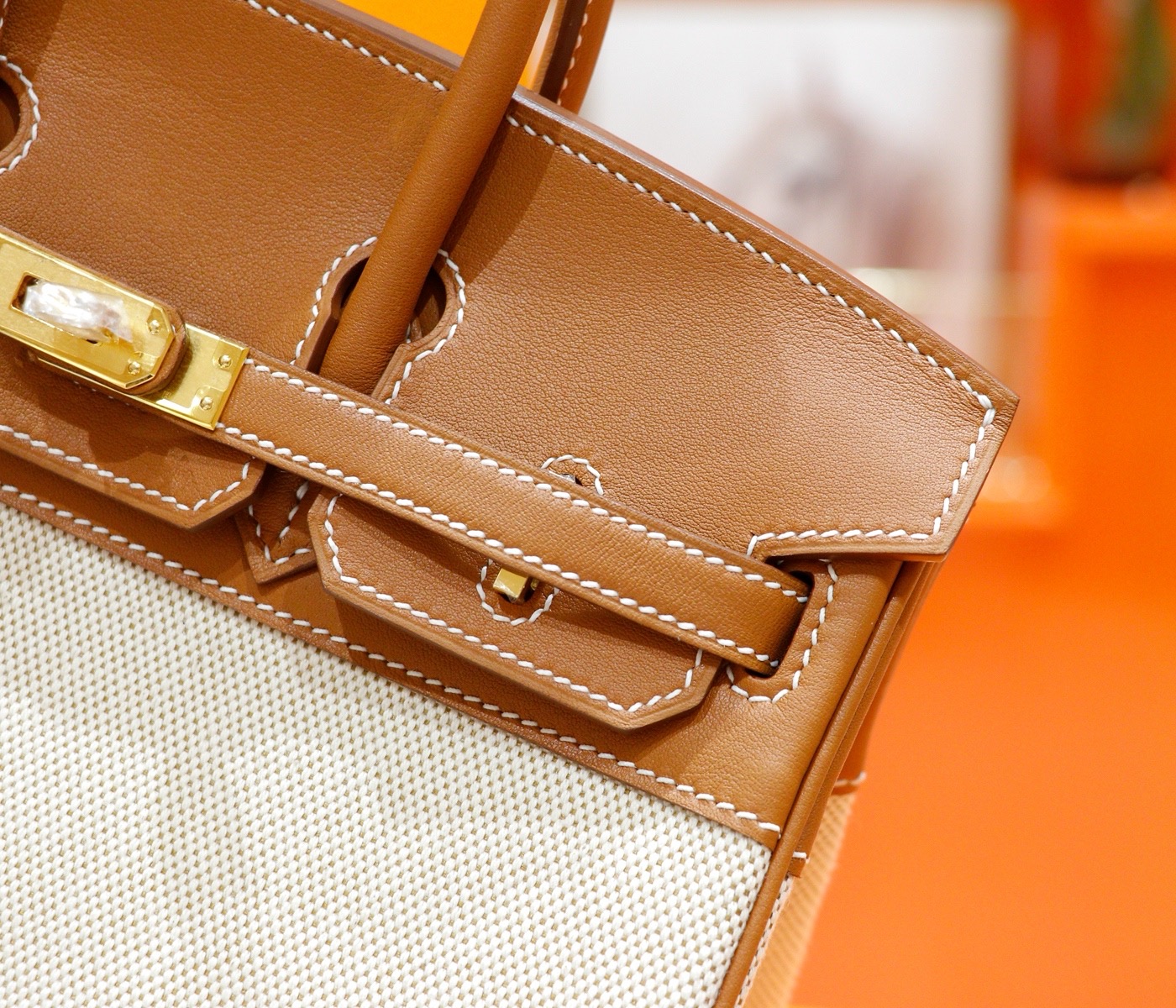 MrBirkin Birkin Swift Leather & Canvas Brown & White Gold Hardware 25cm Full Handmade